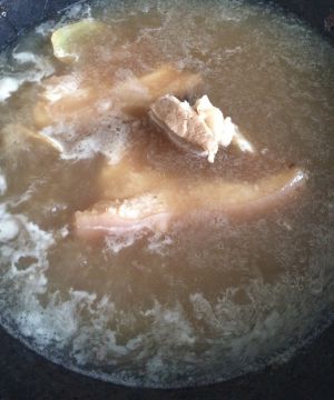 肉洗净切2半,冷水放锅煮,同时放料酒 姜我还放了点老抽,煮10分钟左右