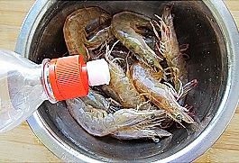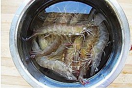 鲜活的虾买回来,去掉沙线,剪去虾须,清洗干净后沥干水分;