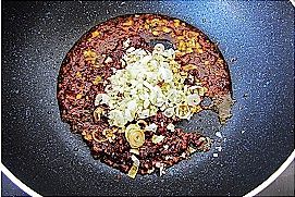 放入少量葱姜蒜,3勺豆瓣酱(辣的那种)剁椒(小米椒)剁碎哦
