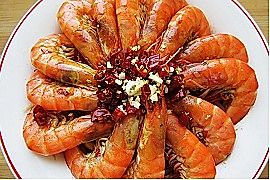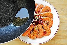 将事先切好的辣椒和蒜末放在虾上;