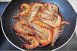 翻炒一会倒入,虾尾,酱油2勺,海鲜酱油2勺,翻炒一下