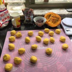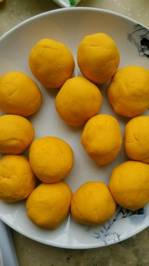 南瓜泥弄好,加入糯米粉和中粉,慢慢加。如果面团可以成团而且不粘手了。就不要再加粉了,否则会太干了。成团后。再把面团摘成一个个小团,大小随意自己喜欢,准备好豆沙。