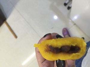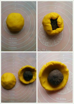 将分好的南瓜面团捏成一个小帽子的形状,把豆沙馅放进去,收口,收口朝下,整整形,弄圆一点!