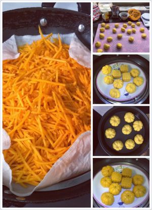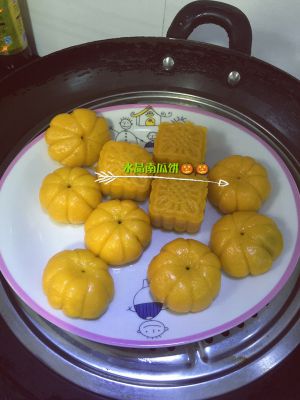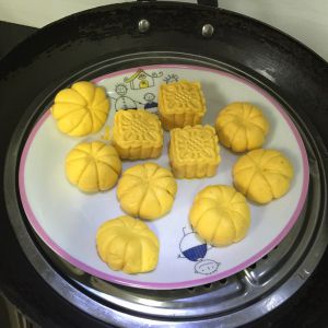 南瓜饼蒸好之后开盖,稍微晾凉一下,装盘,可以享用喽!萌萌哒的豆沙馅水晶南瓜饼出炉喽!