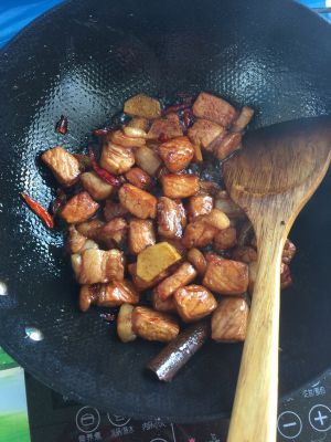 五花肉切丁,抄水去沫,入八成油温,炸至起泡。砂锅底垫香葱,姜片,八角,香叶少许。半两冰糖熬糖色(不要熬太过,容易苦),糖色熬好后加适量的水,再放入少许冰糖。加生抽少许,海鲜酱,排骨酱适量,放入五花肉。砂锅置小火,餵至六成熟,改大火收汁。成菜不油腻,入口肉质细腻