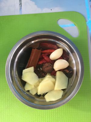 再加入叉烧酱、老抽、盐,以及切好的土豆,翻炒。