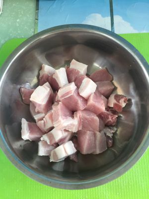 五花肉清洗一下,锅里下凉水,温水状态下,加入五花肉,加入料酒,这一步是需要去除血水,浮沫,焯一下就起锅,五花肉出锅后用清水再清洗一下,
