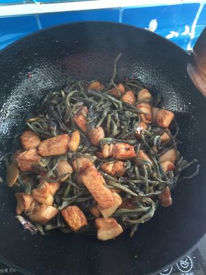 放入豆角翻炒 加入盐一小碗水炒30秒