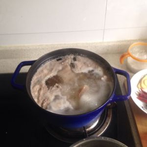 将姜片葱放入肉锅,倒入所有料酒,沸腾。加入较大量热水,生抽,开锅后转小火,加盖煮25分钟