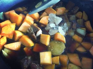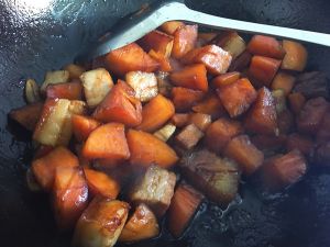 锅内番薯翻炒至色泽变深后倒入红烧肉,往锅内加入三分之二的水加红烧汁及黄冰糖适量后加盖转大火焖煮,其间开盖用锅铲略微翻动一下