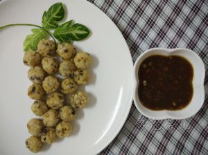 可以把鱼香汁淋上豆腐丸子,或丸子蘸鱼香汁。