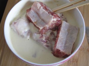 猪肋排在水中浸泡30分钟,中间多换几次水,漂洗干净。沥干水后放盐,酱油,葱,姜,陈皮,料酒,带上一次性手套拌匀,放冰箱冷藏腌制2~3小时