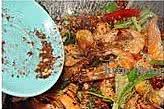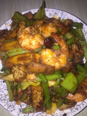 锅内少许油,干辣椒爆香放入麻椒爆一下,加葱段姜片爆香,下炸好的虾翻炒两下,加入事先调好的汁,翻炒至汁水只剩一点点就可以出锅了。