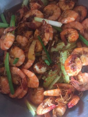 将剩油到出 洗净 放少量油 放辣椒(根据个人口味),姜末,葱末 炒香后放入芹菜 莴笋 藕 花菜 加入盐 糖 番茄酱(或蒜蓉辣酱)等佐料翻炒 最后放入虾和炸好的土豆条 翻炒均匀 出锅即可