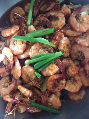 开大火放入虾,变色后放入葱段爆炒,出锅前30秒倒入一些香醋提香