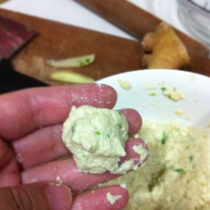 一小块豆腐用錾刀压碎如图,也可用手抓碎,投入图1,用手搅和抓挤,肉圆丛拇指和是指形成的圈中挤出。