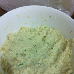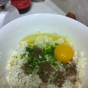 把豆腐在开水中汆烫一下沥干取出,压成豆腐泥,这次的豆腐买得有点多,加了有约1平小匙的盐,豆腐是直接吃都可以的哈,少量多次加盐,拌匀后自己尝尝就好了。然后加入1汤匙的面粉2汤匙的红薯淀粉拌匀。
