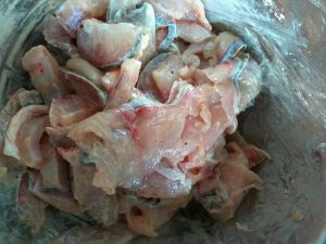 将鱼肉切块,用盐、花椒面、料酒和姜腌制一小时。
