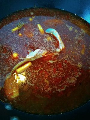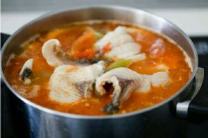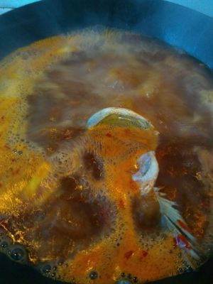 先加入几勺锅中的料汤,将干料倒在鱼肉上。