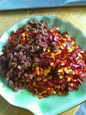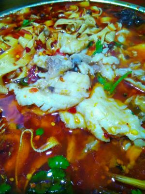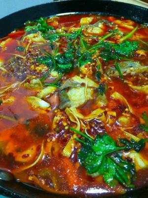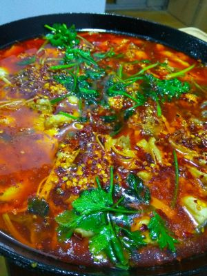 花椒,干辣椒,香菜放在鱼片表面,浇入烧热的油,那声音,很美妙,会喷溅,离远一点