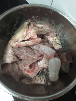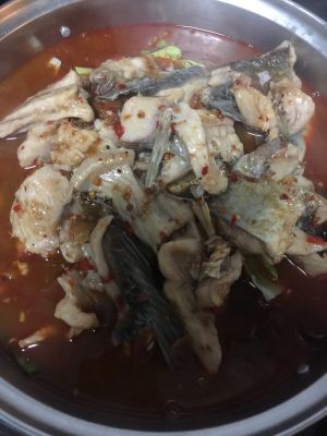 如图所示把鱼骨切小块,锅底放入少许油,放入辣椒花椒爆锅,加入鱼头鱼骨翻炒五分钟加入3000毫升水,一勺盐,大火烧开,继续煮10分钟,划入鱼片,不要搅拌鱼片容易变散,加入喜欢吃的蔬菜,我加的是白菜,金针菇,菠菜,当然菠菜要最后放,再次沸腾后维持两三分钟即可。