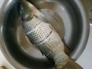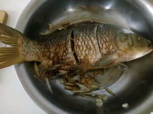 将葱姜蒜放入鱼肚中,里外放入适量的花椒大料盐酱油料酒醋