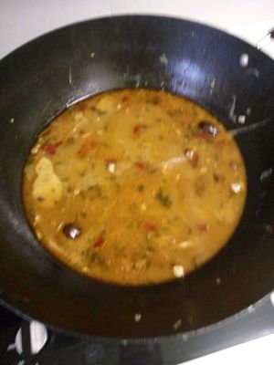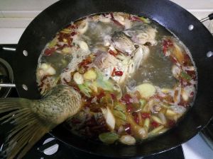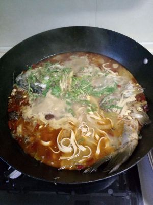 倒入适量用干辣椒炸过的油放入葱姜爆香,放了3调羹勺郫县豆瓣酱炒一下,下入鱼头、鱼骨