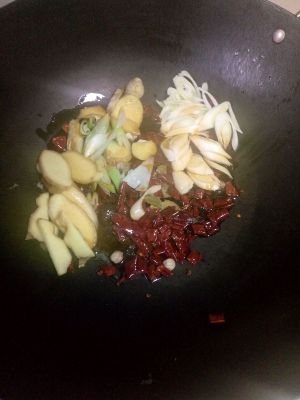 锅内加油放豆瓣酱炒出红油,放葱姜蒜片、干红辣椒、花椒煸香