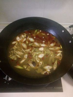 锅内倒油,加入姜蒜八角花椒红辣椒炒香,加入一勺郫县豆瓣酱炒出红油,再加入一碗清水,大火烧开