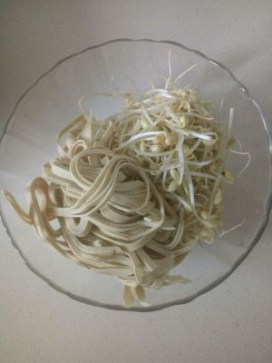 把配菜洗干净,豆芽跟摘掉魔芋切条备用。