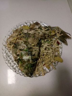 草鱼是市场上买鱼时卖家直接杀好的,所以不用刮鱼鳞、开膛破肚了,剁下鱼头,从中间把鱼头剁开