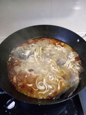 将鱼片和汤到入盛鱼头、金针菇的汤碗中,再将烧好的花椒、红辣椒油浇入汤碗内即可。