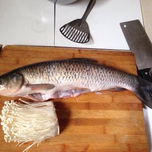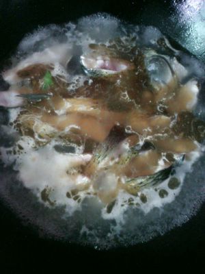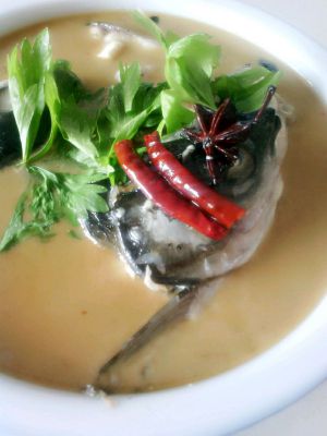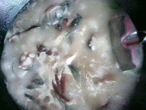 锅里放入50g油,烧热,放调料中的主料,炒香后加入400ml水,煮到要开将鱼头部分先下锅,待开后放入剩下的鱼。