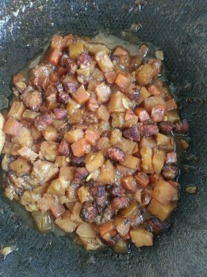 锅中有给五花肉炒糖色的油,热锅够放葱,蒜,五花肉,然后料酒和酱油,盐,十三香,胡萝卜。倒足够的水,中小火一直熬一直熬,然后放入土豆,再熬,最后放西葫芦。继续熬,知道所有实物都很软汤汁也差不多了。哦了