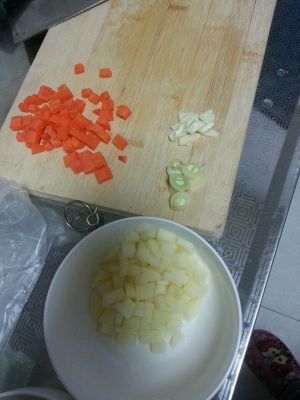 胡萝卜,土豆切丁,葱和蒜切片。土豆用水泡一下土豆的淀粉