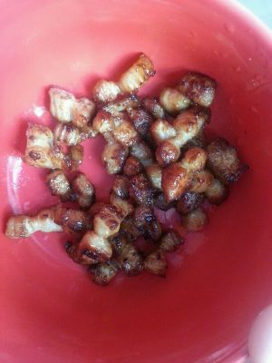 油加温热,放入葱白,姜丝,蒜片,煸炒,再放入五花肉炒出油,,注意一下那个皮会炸锅,刚刚被烫了下