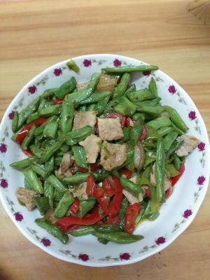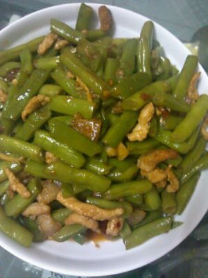 炒完肉之后,锅中剩部分油,再倒点食用油,将四季豆入锅翻炒,基本熟后再将炒好的肉片和辣椒倒入锅中翻炒,这时加入味极鲜、盐、鸡精,炒匀后即可出锅。