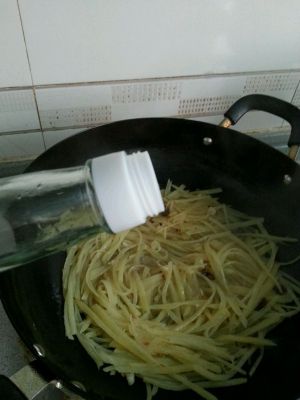 倒入土豆丝,中火翻炒。土豆丝微变色时加入醋、盐、鸡精。再翻炒片刻即可。(根据个人口味,土豆丝喜欢吃熟一点的可以翻炒久一些。