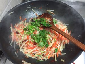 放入杭椒丝翻炒几下 再放入沥干水的土豆丝继续翻炒 炒到杭椒出味 加盐 鸡精 少许水收汁即可