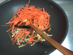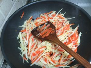 方法一:先放胡萝卜翻炒,胡萝卜只有和油充分结合才能保留他的维生素。五成熟后放入土豆丝。