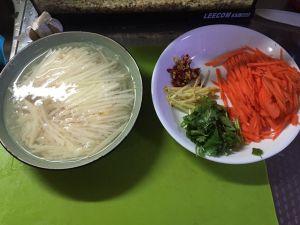 土豆切丝,用冷水浸泡,便于淀粉析出,防止土豆变色。胡萝卜切丝(我觉得配色很好看)香菜切段