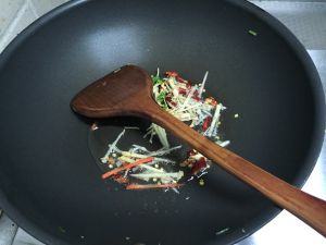 锅烧热倒入油 放入姜 花椒 蒜中小火翻炒至香