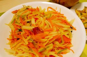 把土豆 胡萝卜 擦成丝 把葱切成段 备用