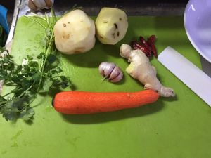 备料,胡萝卜,土豆去皮。香菜洗净。葱,姜,辣椒等