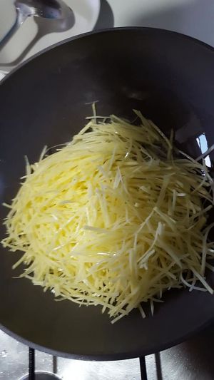热锅冷油。有热后倒入沥干的土豆丝翻炒。