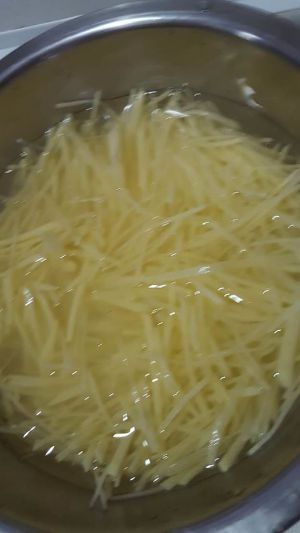 把土豆去皮切丝 放入容器用水淘洗3~5遍 目的是把土豆中的淀粉洗去 这样炒出来口感更脆 洗到水清澈时沥水备用
