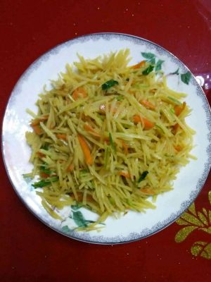 起锅熟油爆香蒜蓉,倒入土豆丝和胡萝卜丝翻炒至熟加盐和鸡精炒匀