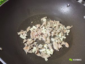 凉锅热油之后,放入大蒜炝锅,倒入廋肉翻炒至廋肉变色,盛出待用;
