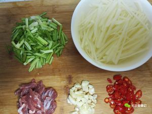 将土豆去皮以后切丝,用凉水侵泡5分钟后洗2遍。芹菜切段,瘦肉切条,大蒜切碎,红椒切圈;