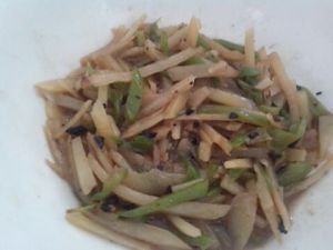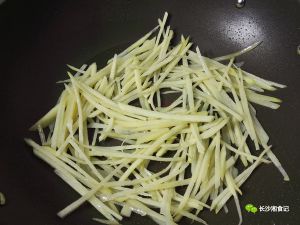 土豆丝放入锅中爆炒,待土豆丝颜色转趋透明后,加入盐1/5茶匙,糖1/2茶匙,酱油1/2茶匙,醋1茶匙,拌匀炒热